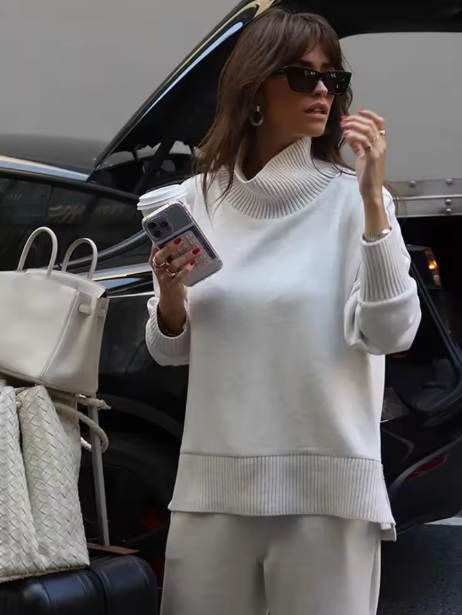Φανταστείτε: ένα κρύο χειμωνιάτικο πρωινό. Μπαίνετε εύκολα στο μαλακό πλεκτό σετ Astrid - ένα πουλόβερ με ψηλό λαιμό και ένα παντελόνι με φαρδιά πόδια που σας χαρίζει κομψή εμφάνιση. Ιδανικό για ένα άνετο brunch ή μια χαλαρωτική μέρα στο σπίτι. Το Astrid είναι η καθημερινή σας δόση άνεσης και φινέτσας.
